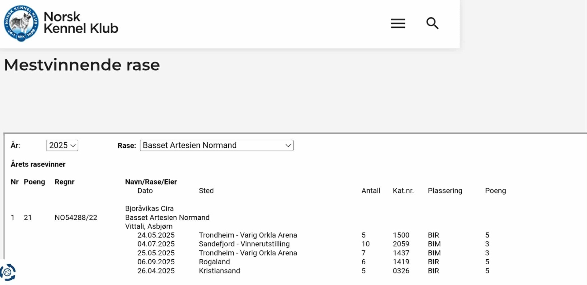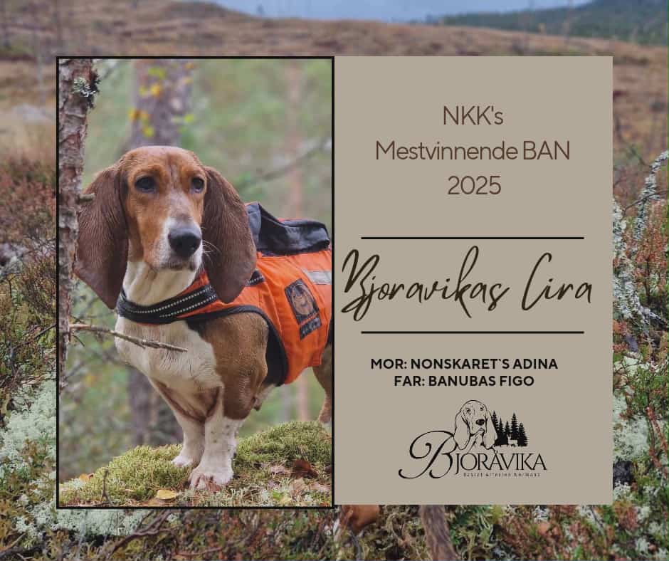 Hvert år kårer NKK Årets Mestvinnende i hver rase. Det er gledelig å se at NKK` s Mestvinnende Basset Artesien Normand 2025 ble Bjoråvikas Cira med 21 poeng!